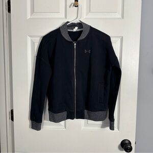 Size small Under Armour black and gray zip front jacket. Women's size small, loose fit. Logo on button blacket. Two large side slit pockets, inner slide cell phone pocket, interior fleece, exterior cotton/poly blend