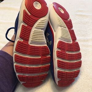 Blue red and white Under Armour athletic sneakers. Size 6Y. These are in used condition. Please see photos for additional info on wear and tear. Price reflects usage.