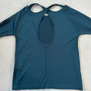 Under Armour women’s long sleeve work out top. Back cut out detail. Sleeves have thumb holes. Dri fit material. Small. Teal. Good pre owned condition.