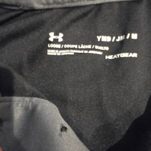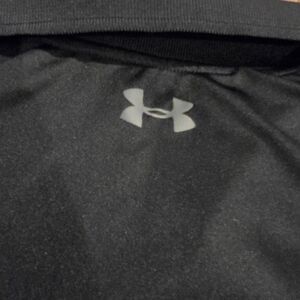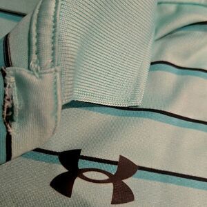 Two stylish Under Armour polo shirts. One features green with stripes, the other is solid black. Ideal for versatile wear.
