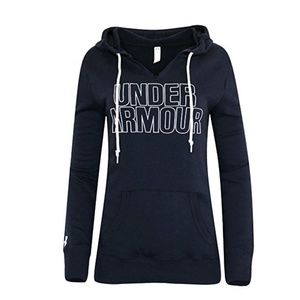 Under Armour v-neck hooded sweatshirt. It also has a kangaroo pocket and white drawstring. Super soft and cozy, in Navy blue. I absolutely love mine (reordered). Its a small but could fit up to a medium very comfortably.