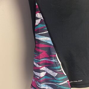 Black tank with Abstract side panels (insets) with shimmery white, gray, teal, light blue, and fuchsia shades