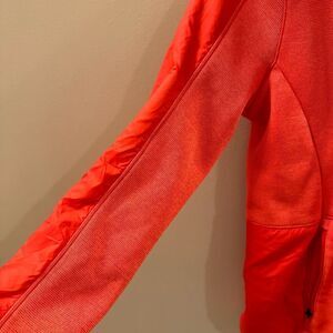 fleece full zip jacket in bright orange with hood and front zip pockets.