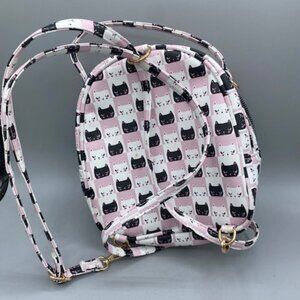 The Under One Sky Cat Mini Backpack is a stylish and trendy accessory for women. Featuring a unique animal print pattern with a cute cat theme, this mini backpack has a zip closure and multicolor handle/strap. The exterior is made of vinyl material with gold hardware accents, adding a touch of sophistication to the casual design. The inside lining is a playful pink color, making it a fun and eye-catching choice for everyday use. This backpack is a perfect blend of fashion and functionality, making it a must-have addition to any wardrobe.
