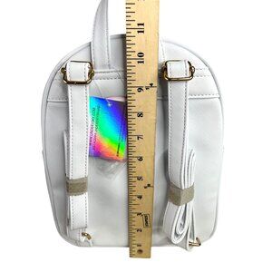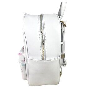 This decorative mini backpack exudes charm with its whimsical cat and flower print on a white backdrop. The playful pom pom accent enhances its delightful aesthetic, making it a standout accessory. Crafted for style and functionality, it's an ideal companion for small essentials while adding a touch of cuteness to your everyday look.