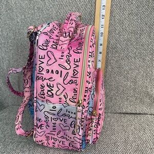 This stylish backpack from Under One Sky showcases a vibrant pink color with a unique love-themed print, perfect for adding a playful touch to your ensemble. Its compact design ensures practicality while maintaining a trendy look.