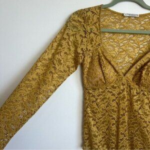Rosie bodystocking in mustard is made from soft recycled materials crafted into an exclusive floral lace with an eye-catching glossy thread. The sweetheart neckline adds a romantic touch and provides a flattering fit. The bodystocking features a string bottom and long sleeves - perfect for the fall season.