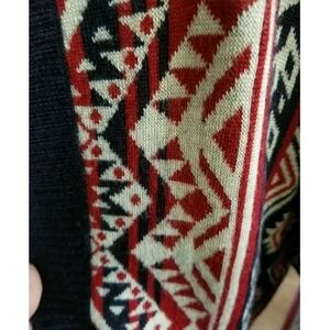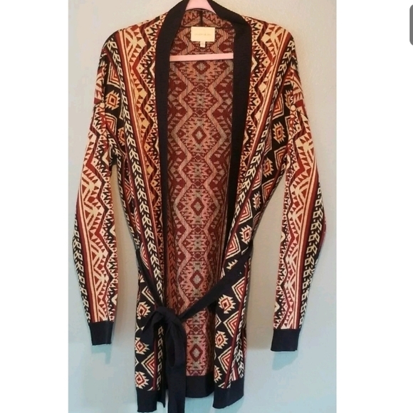 Under Skies Aztec Tribal Dark Red Navy Blue Belted Open Cardigan Size M Boho
