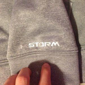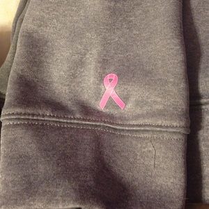 Grey hoodie with a pink under armour sign. Has storm written on the left sleeve and a breast cancer symbol on the right! Only wore couple times. There is nothing wrong with it!