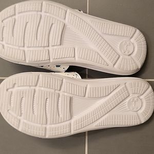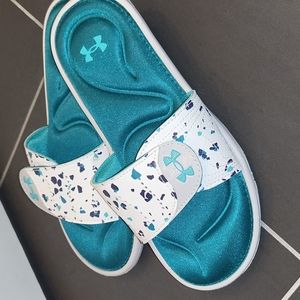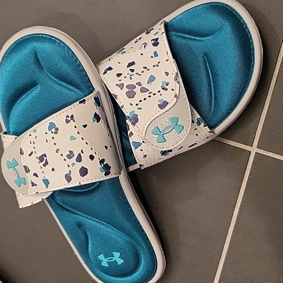 blue and white gently used under armor youth slides, size 5