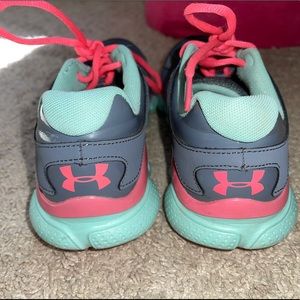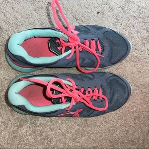 Grey under armour sneakers in really good condition! Light blue bottoms with pink accents and pink laces. Heal in shoe is very comfortable/supportive. Size is 6Y (I wear a 6.5, shoe is slightly bigger than desired for my foot size). Bottom of shoes are dirty from being worn outside but could be cleaned if desired by scrubbing with sponge or toothbrush. Toes are slightly scuffed (see if photos) extra pair of black laces included!