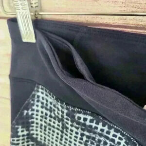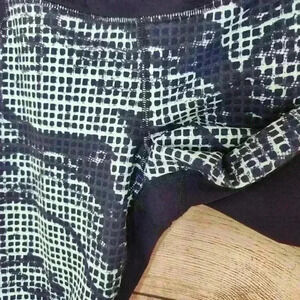 Under armour women's fitted leggings geometric print size small. Small pocket on front waist line. Navy blue and teal. In excellent pre-owned condition. No flaws. Measurements are approximate and taken flat.