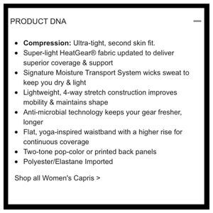 Under Armour ultra tight second skin compression fit workout leggings: Capri length. Gray with black stripped back panel on legs. Light weight with signature moisture wicking 4-way stretch fabric. Anti-microbial technology to keep you fresh. Excellent gently used condition. Please see photo section for approximate flat measurements. Material: 80% polyester, 20% elastane.
