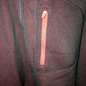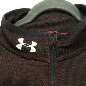 Runners, get ready for winter training. UnderArmour RUN fitted cold gear quarter zip jacket/shell size large. Black/red mesh-like outer/red lining. thumbholes on each sleeve. 94% polyester/6% elastane.