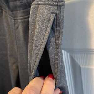 Slight flare cuffs. Elastic and inside tie waist. Micro fleece interior. Gray heather exterior.