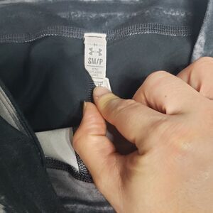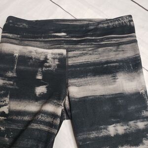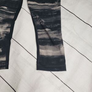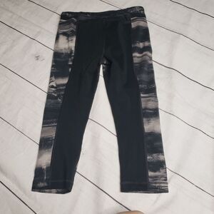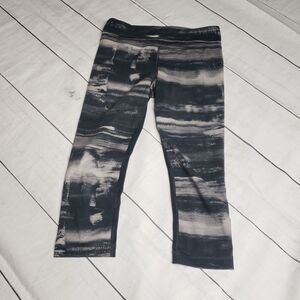 UA crop running athletic pants. Front is a fun black grey white streaked pattern. Back is more solid. UA Logo on upper by back.
