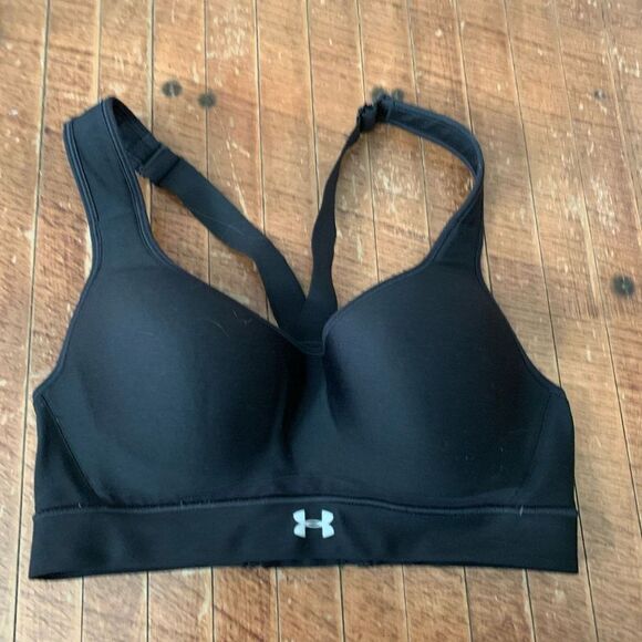 Under Armour black, fitted, racer back, strappy athletic bra. In good, used condition. From a pet and smoke free house. Happy to bundle!