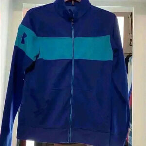 Pre-owned Under Armour track jacket in light blue / dark blue color combo with their symbol on right arm. It’s in great condition. No rips, no tears, no stains.