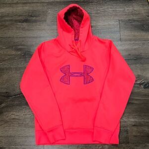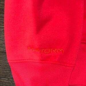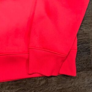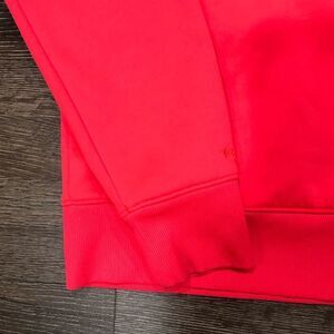 Excellent like new condition! The only flaw you will see are a few dryer fuzzies on the strings from the initial wash. This is a semi-fitted hoodie that is extra warm!