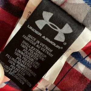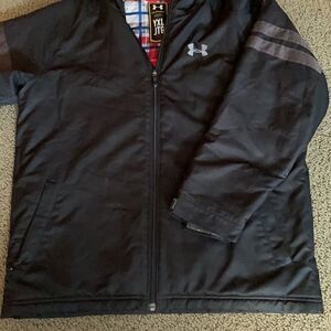 UA Storm Zip jacket with hood and pockets! Velcro at wrists. Appears more masculine but could easily be unisex. Fun pattern on the lining to boot š