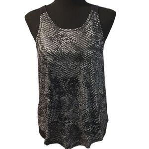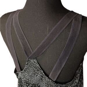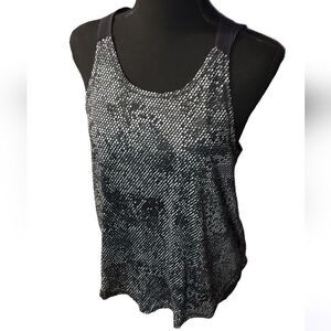 Under armour tank. Black with gray and white dots. Mesh straps. Excellent condition. No size tag but fits like a medium. Bust 17.5". Length 25" to the center and 22" to the sides.