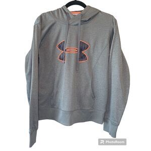 Under Armour gray fleece storm hoodie with gray/black stripe with flourescent coral outline big logo Semi-Fitted slimmer athletic cut Armour Fleece construction finished with highly water-resistant UA Storm technology Soft, brushed inner layer traps heat for all-day warmth and comfort Lined, two-piece hood with crossover neck for enhanced comfort Super streamlined kangaroo pocket design Ribbed cuffs and hem Polyester, machine wash & dry. Excellent- Used Condition