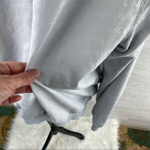 Under Armour Men's Unstoppable Emboss Bomber size large. White polyester/Elastane blend material with stretch. Waterproof with moisture transport system. 4 way stretch and fully lined. Front zipper closure and slams pockets. Logo on front. No holes or stains, one small pinhole size mark as pictured. Hard to see. Model shows same jacket in different color.