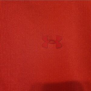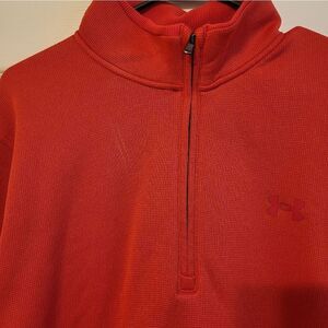 Under Armour Golf bright orange zipper neckline pullover, size L, loose, coldgear, collard, long-sleeved, thicker soft material, content tag is missing, Under Armour logo over left chest and on upper back, excellent condition.