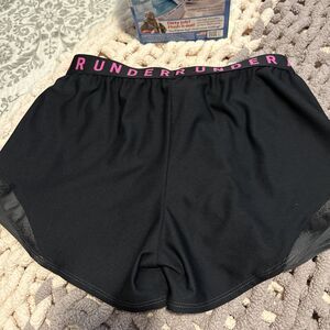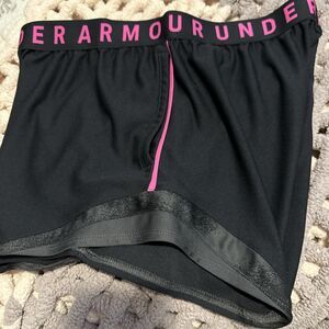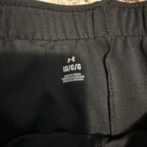 The product is a pair of Under Armour women's athletic shorts in size L. They are black in color and made of polyester blended fabric, with a solid pattern and an elastic waistband for a comfortable fit. Suitable for gym training and running, these shorts are machine washable and perfect for summer workouts.