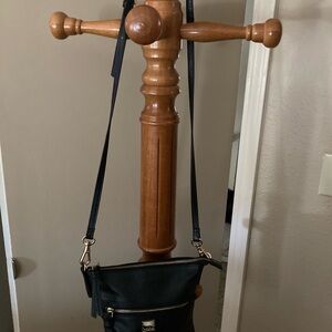 Sleek black crossbody bag. Gold hardware accents. Front zipper pocket. Adjustable strap.