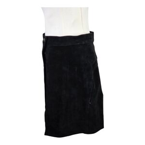 Step into timeless sophistication with this Understated Leather genuine suede mini skirt in classic black. Crafted from 100% real suede leather, this luxurious wrap-style skirt delivers effortless edge with a flattering high-waisted fit and sleek silhouette. The side button-front detail features six burnished brass buttons that add just the right amount of vintage-inspired charm. (Missing 1 button)