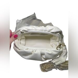Understated Leather White Vegan Clutch Bag NWT Gold Chain Tassel Detail