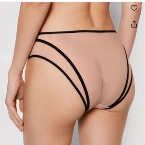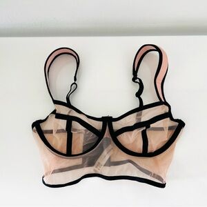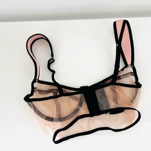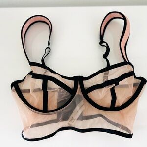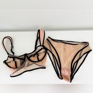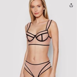 NWOT Brand new Undress Code In The Clouds Bra and panties lingerie set in sheer tan with black piping. Extremely chic and sexy. Bra has padded shoulder straps something I have never seen and a genius way to make them comfortable. Panties are high waisted. The full set is exactly as last photo. In first model photos the panties are a simpler version with less piping. They are actually cuter than the photos. Bra is size M and panties are a size S and come with the adhesive sticker still on them. Made in Poland. Never worn. Purchased in Paris.
