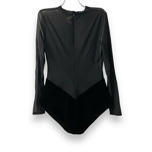 Fabric has some stretch to it. Completely sheer at back, sleeves, midriff. Velvet portion is not sheer. Back zip. Snap closure at crotch.