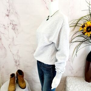 Excellent Condition no flaws Stylish gray sweatshirt paired with classic blue jeans. Perfect for a casual day out. Grey with blue denim stripe arm. Size xs
