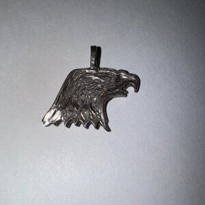 Solid sterling silver eagle head pendant. About the size of a quarter. We can also make this in pewter and in gold. It can also be antiqued to bring out more detail. This pendant weighs 3.76 grams. This pendant is not 100% complete. It needed some finishing on the bottom left corner and it needs some polishing to make it perfect but only if somebody is really looking closely can they see this pendnant is not perfect.