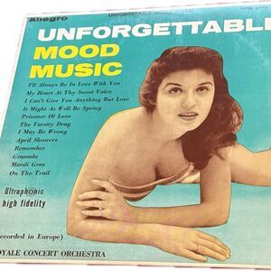 Vintage vinyl record featuring 'Unforgettable Mood Music' by Royale Concert Orchestra. Classic cover art with teal and white design.