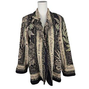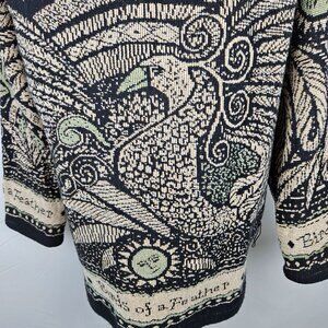 Boho jacket with large unique Bird design, Suns and swirling leaves. This tapestry jacket, exquisitely crafted in the USA, combines artistic design featuring "Birds Of A Feather" with functionality. The rare jacket's tailored fit and elegant buttons enhance its sophisticated style.