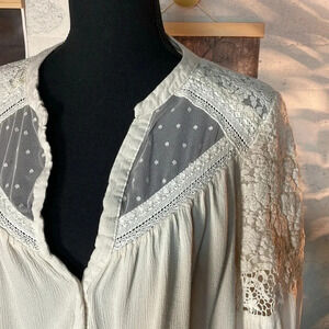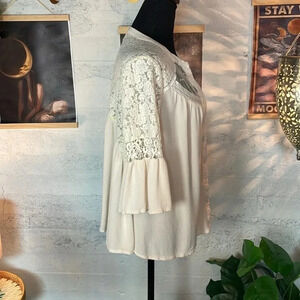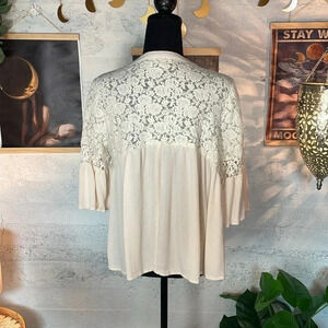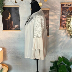 Used umgee cream white lace top. Size medium. This is a beautiful vintage look lace top. Lace top, and flowy bottom, with a ruffle sleeve.