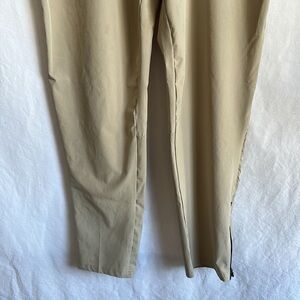 UniPro Qwick-Dry beige and black athletic pants, size L (36–38). Good preowned condition. Inner drawstring. Back belt loop. Two elastic areas at waistband for hanging water bottles or clipping in keys or other valuables. 7.5” zipper at outer legs.