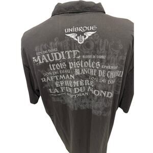 Vintage Unibroue brewery promotional polo shirt featuring the Maudite beer logo on the chest and a large Unibroue graphic on the back with names of flagship beers including La Fin du Monde, Trois Pistoles, Blanche de Chambly, Raftman, and Éphémère. Classic three-button collared style in black. Made in Canada from 100% cotton. Size XXL (TTG). Tag: W2. Excellent collectible for craft beer fans, brewery merchandise collectors, or anyone who appreciates Canadian brewing history. Pre-owned, gently worn, no major flaws noted.