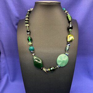 Beautiful green semi-precious gemstone & glass necklace featuring a large green oval jadeite semi-precious stone, along with green glass and abalone shell beads in various sizes/shapes. Small green stone chips also test as “jadeite” on Presidium II gem tester. Hangtag features logo identified through AI search as “Unica” brand. Unica Jewelry is a handmade jewelry online store selling pieces crafted with best and highest quality materials available. Necklace measures 18-21” adjustable with extender. Lobster claw closure has small area of discoloration/corrosion on one side (see close-up photo). Otherwise, in good pre-owned condition.