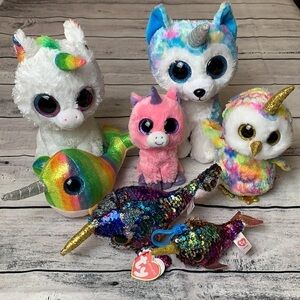 Unicorn Beanie Boo lot/bundle of 7 animals: 1. Helena the Husky-Corn 2. Pixy the rainbow unicorn 3. Enchanted Ty Silk rainbow Owl-Corn 4. Magic the pink and purple unicorn 5. Nori the rainbow Narwahl 6 and 7. Calypso the flip sequin narwahl small and key chain version.