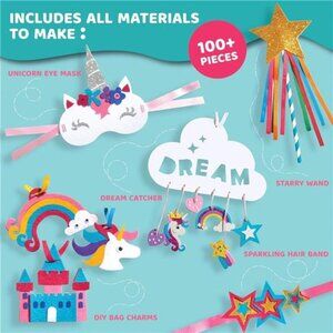 🧿8-IN-1 KIDS CRAFTS – Create a rainbow of crafts with your Unicorn craft kit from Jackinthebox, complete with a dreamcatcher, sleep mask, 3 bag charms, headband, wand, and parfait recipe.