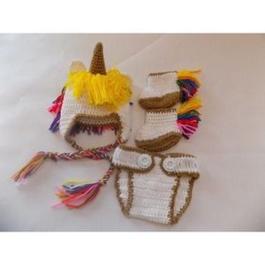 This adorable crochet baby Unicorn hat, diaper cover & booties are made out of worsted-weight yarn.