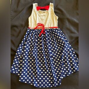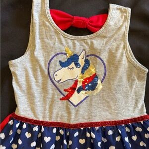 Charming kids dress featuring a playful unicorn heart design. The blue skirt with white hearts adds a whimsical touch, while the gray top complements the look. Perfect for any little one's wardrobe.
