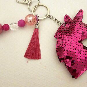 Add a little magic to your day with this sparkling unicorn keychain! Made with shimmering pink reversible sequins, the unicorn design sparkles beautifully in the light. Accented with a matching tassel and pink bead strand with crystal-like details, this keychain doubles as a fun purse charm or backpack accessory. Perfect for unicorn lovers, kids, or anyone who enjoys whimsical accessories.