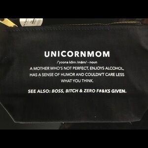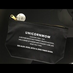 “Unicornmom” pouch black canvas bag white lettering. Measures 6”X10’