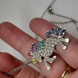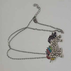 Unicorn Multi Color Rhinestone 1.5" Silver Tone 18" + 2" Ext Necklace