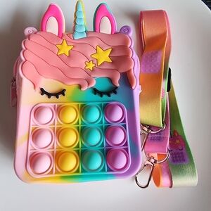 Colorful unicorn-themed Pop It crossbody bag with adjustable strap. Features vibrant rainbow colors and playful design. NWOT